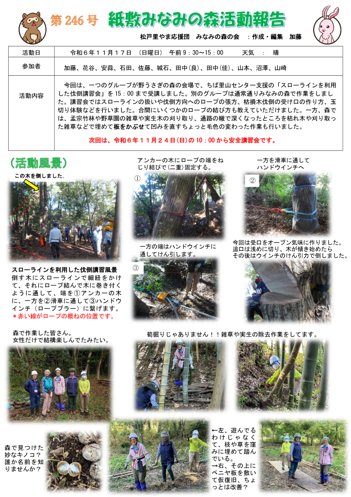 ■(2024/11/17)活動記録 第246号 スローライン、伐倒、ロープワーク講習会ほか